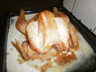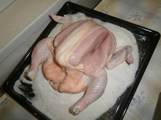Avem nevoie de un pui(intreg, de grill), 1kg sare(preferabil gema marunta dar se poate folosi orice tip, chiar si fina iodata) si un cuptor :D.