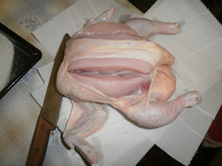 Puiul se curata un pic(de cotoare sau altele) si, daca e mai mare, se cresteaza pieptul( ca sa se patrunda suficient si aceasta parte care este cea mai carnoasa). Se clateste un pic si se lasa sa se scurga apa.